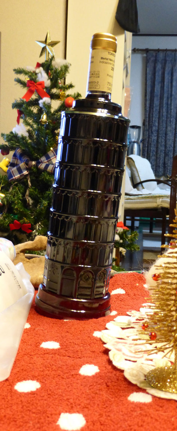 クリスマスパーティー(?)は、22日に家族とやりました。ケーキはスポンジだけ買って、クリームと苺などで飾りつけ。売ってた一番安いスパークリングワイン赤と白一本ずつを買って飲みました。あと、叔父さんからピサの斜塔という赤ワインをもらったのですが、それは見た目がすごく面白いので、とっておくことにしました。傾いているんです、あの斜塔みたいに('Д')